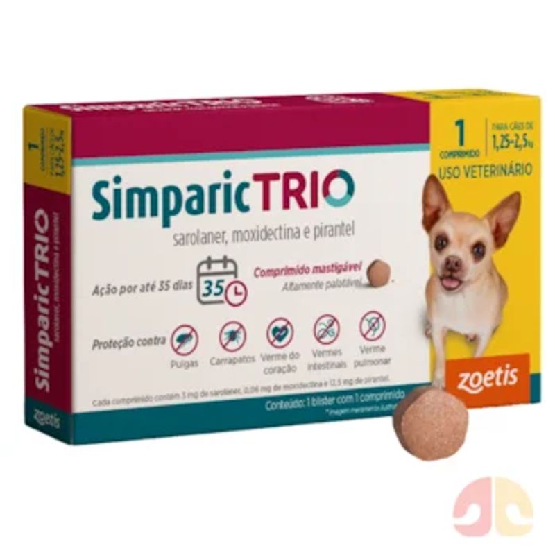 O Simparic Trio 3mg da Zoetis é a solução ideal para a proteção mensal de cães de 1,25kg a 2,5kg. Este inovador comprimido mastigável saboroso oferece um amplo espectro de ação, eliminando e controlando pulgas, carrapatos e vermes gastrointestinais, além de ser eficaz no tratamento e prevenção da sarna sarcóptica e otodécica. Sua formulação avançada garante que seu pet fique livre de parasitas externos e internos, contribuindo para uma vida mais saudável e feliz.
