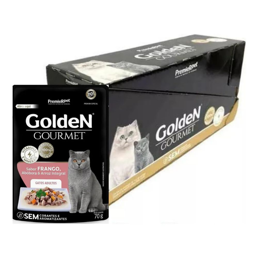 A Ração Úmida Golden Gourmet também é uma excelente opção para gatos que necessitam aumentar a ingestão de água, auxiliando na prevenção de problemas urinários ao manter a hidratação adequada.