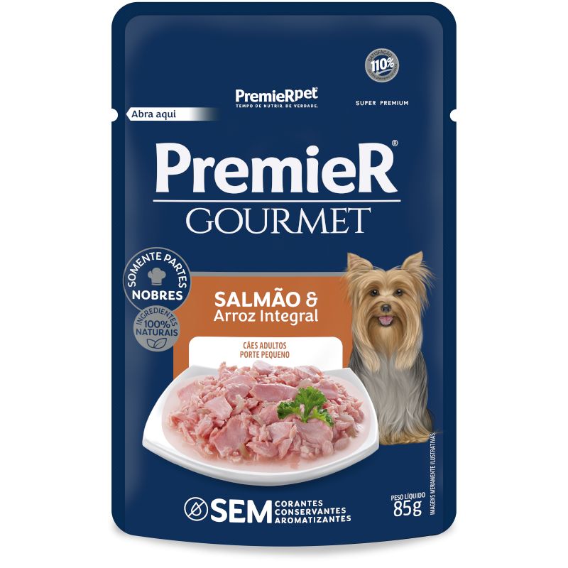 A Ração Úmida Premier Gourmet Salmão e Arroz Integral oferece uma experiência deliciosa e nutrição completa para cachorros adultos.