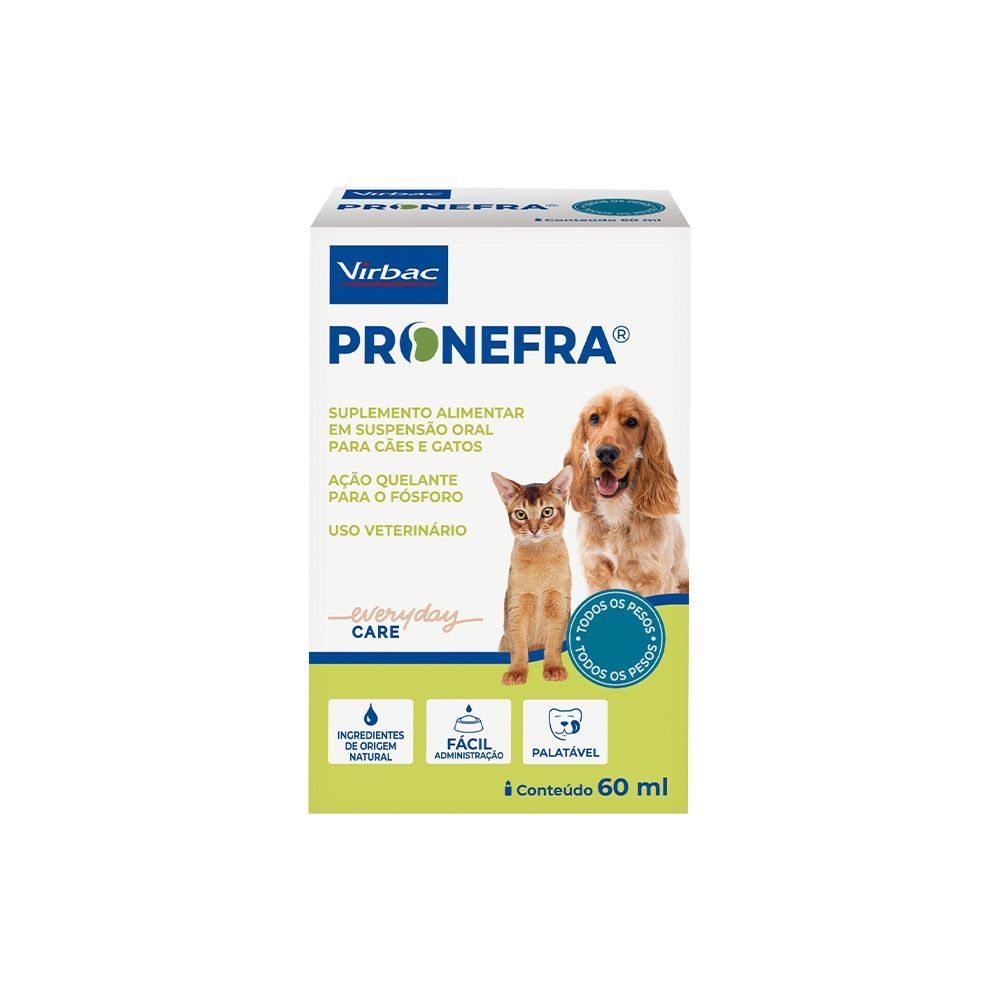 O Suplemento Alimentar Virbac Pronefra para Cães e Gatos - 60 ml é uma solução avançada para o suporte da função renal em animais de estimação. Desenvolvido pela renomada marca VIRBAC, este suplemento é formulado para auxiliar no manejo da doença renal crônica, ajudando a proteger os rins do seu pet. Sua composição única atua ligando o fósforo da dieta e as toxinas urêmicas, elementos que podem sobrecarregar os rins. Ideal para cães e gatos que necessitam de um suporte nutricional específico para manter a saúde renal e prolongar a qualidade de vida.